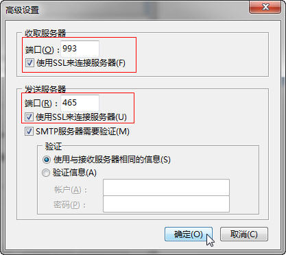 5.点击【确定】,【下一步】帐号设置完成,如若您希望采用SSL 安全连接来收发邮件,请分别勾选【使用SSL来连接服务器】,并确认收取服务器端口为: 993 ,发送服务器端口更为: 465,如下图所示: